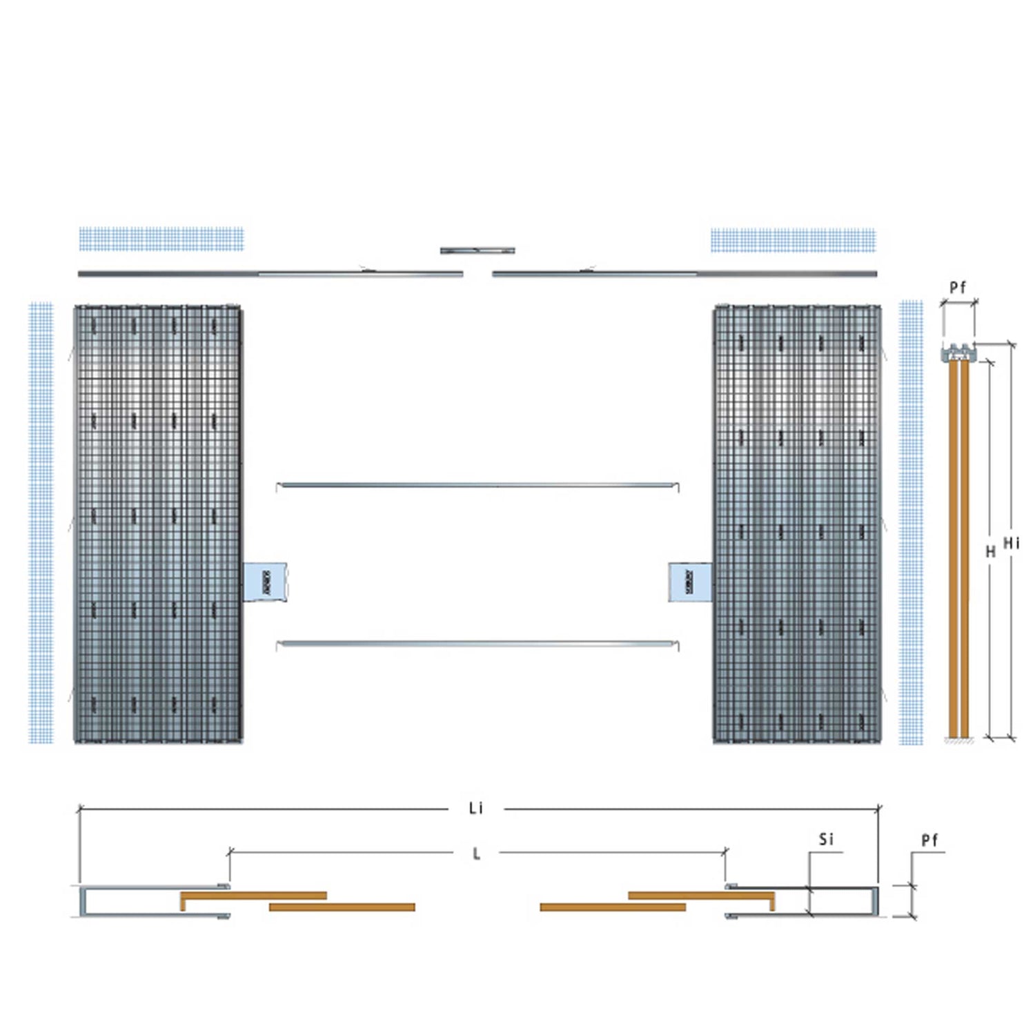 Suspension plates made of galvanized sheet metal, shaped for easy assembly of the doors.
