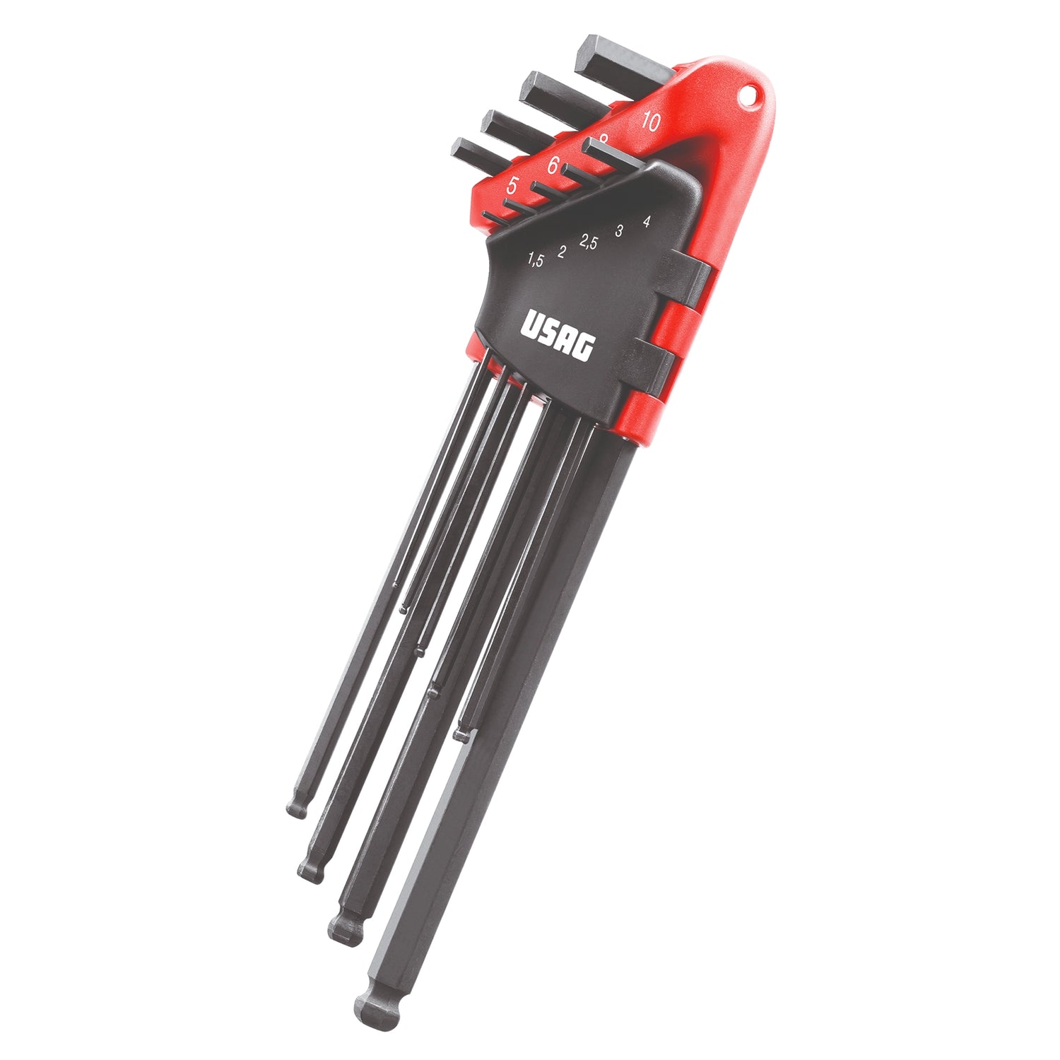 Clés hexagonales Usag 280 XLTS/S9Jeu de 9 clés hexagonales à tête sphérique extra-longues. Pour vis à six pans creux. Modèle qui permet de travailler avec des inclinaisons allant jusqu'à 25° par rapport à l'axe de la vis