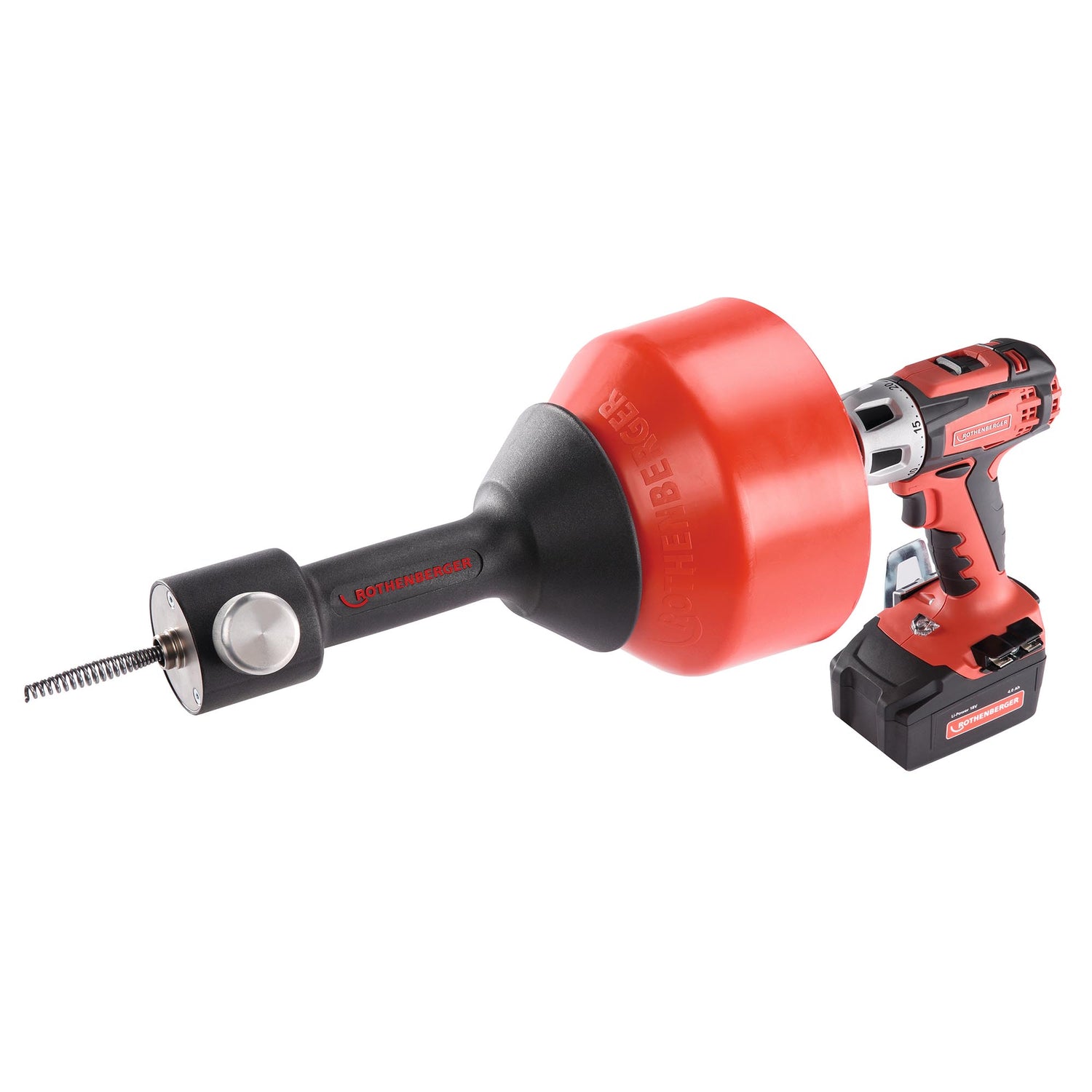 Dispositif de débouchage de canalisations Rothenberger Rospimatic CL, unité de base avec spirale à bulbe 8x7,5mm. Idéal pour éliminer les blocages dans les tuyaux d'évier, de lavabo, de douche et de baignoire jusqu'à Ø 50 mm.
