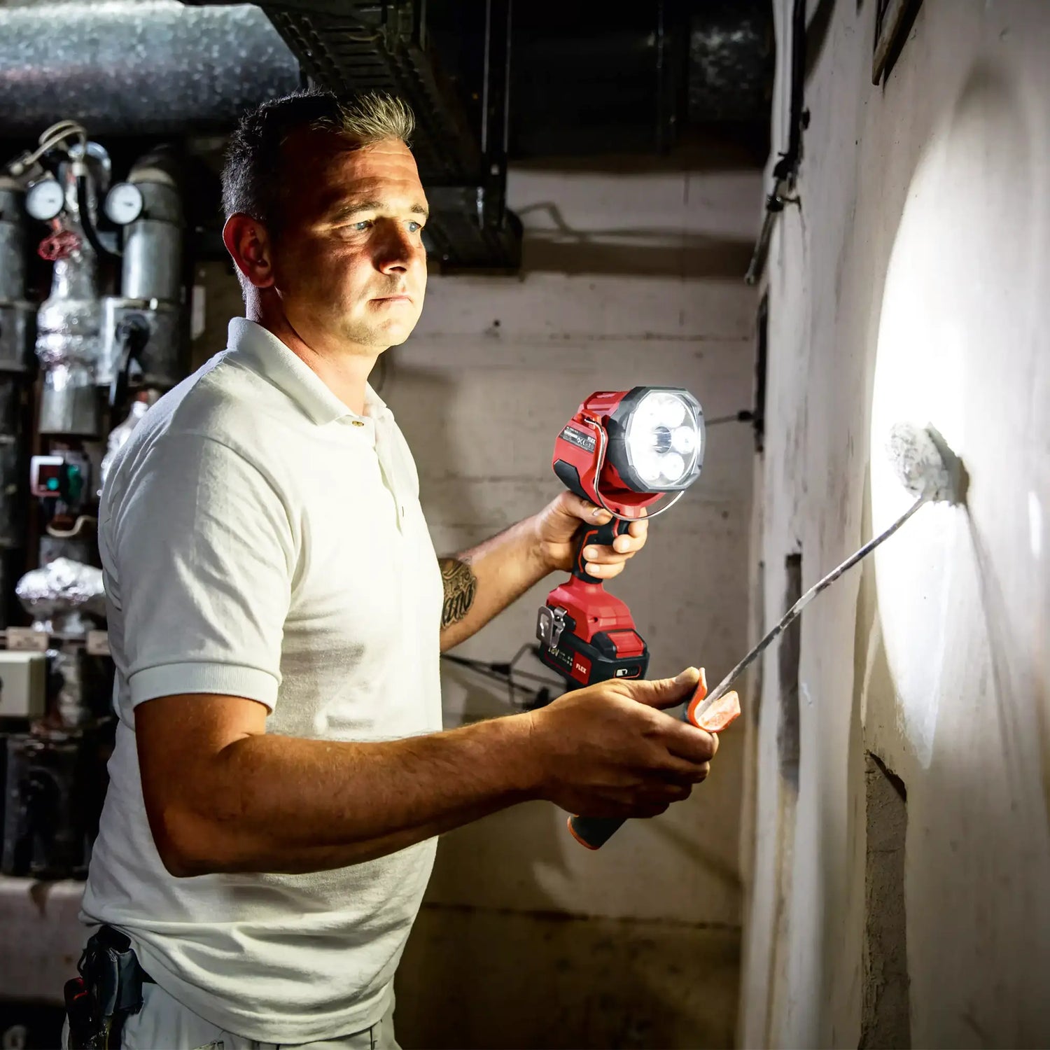 Le Phare à LED Flex DWL 2500 10,8/18 V Il s'agit d'un puissant projecteur alimenté par batterie conçu pour offrir une luminosité exceptionnelle dans n'importe quel environnement de travail. Merci à lui 2 niveaux de luminosité, vous pouvez choisir entre 2800 lumens pour un éclairage puissant et une portée de 630 m, ou 1000 lumens pour une lumière plus tamisée. La LED rouge supplémentaire réduit les effets de diffusion et d'éblouissement, améliorant ainsi la visibilité dans des conditions critiques. La tête lumineuse LED est réglable 180°, vous permettant d'éclairer facilement même les coins les plus difficiles.