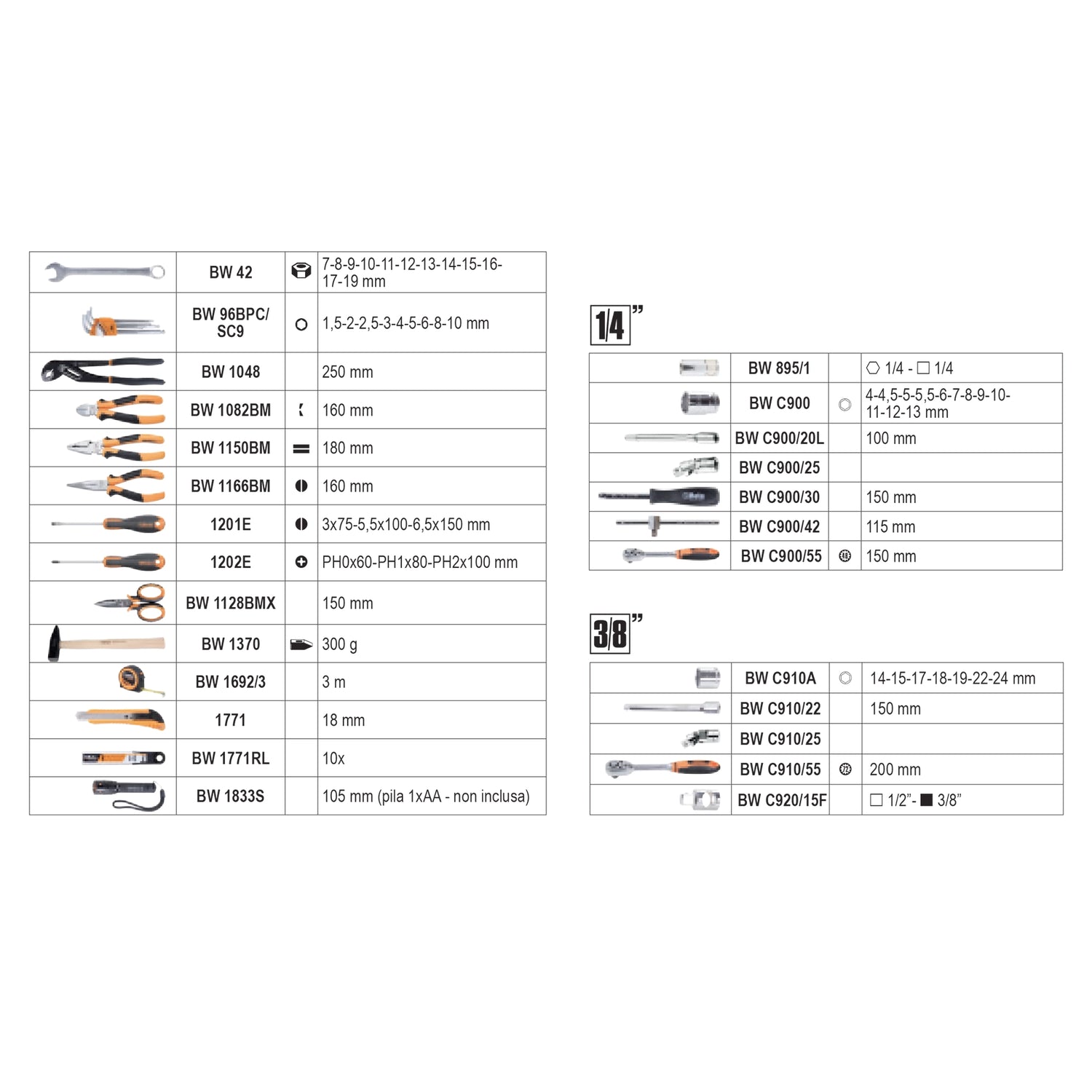 • Large gamme d'outils: Le 2054E 100 propose un ensemble complet de 100 outils, tandis que le BW 2054E-128 comprend 128 outils pour effectuer les travaux de maintenance générale de manière efficace et flexible.