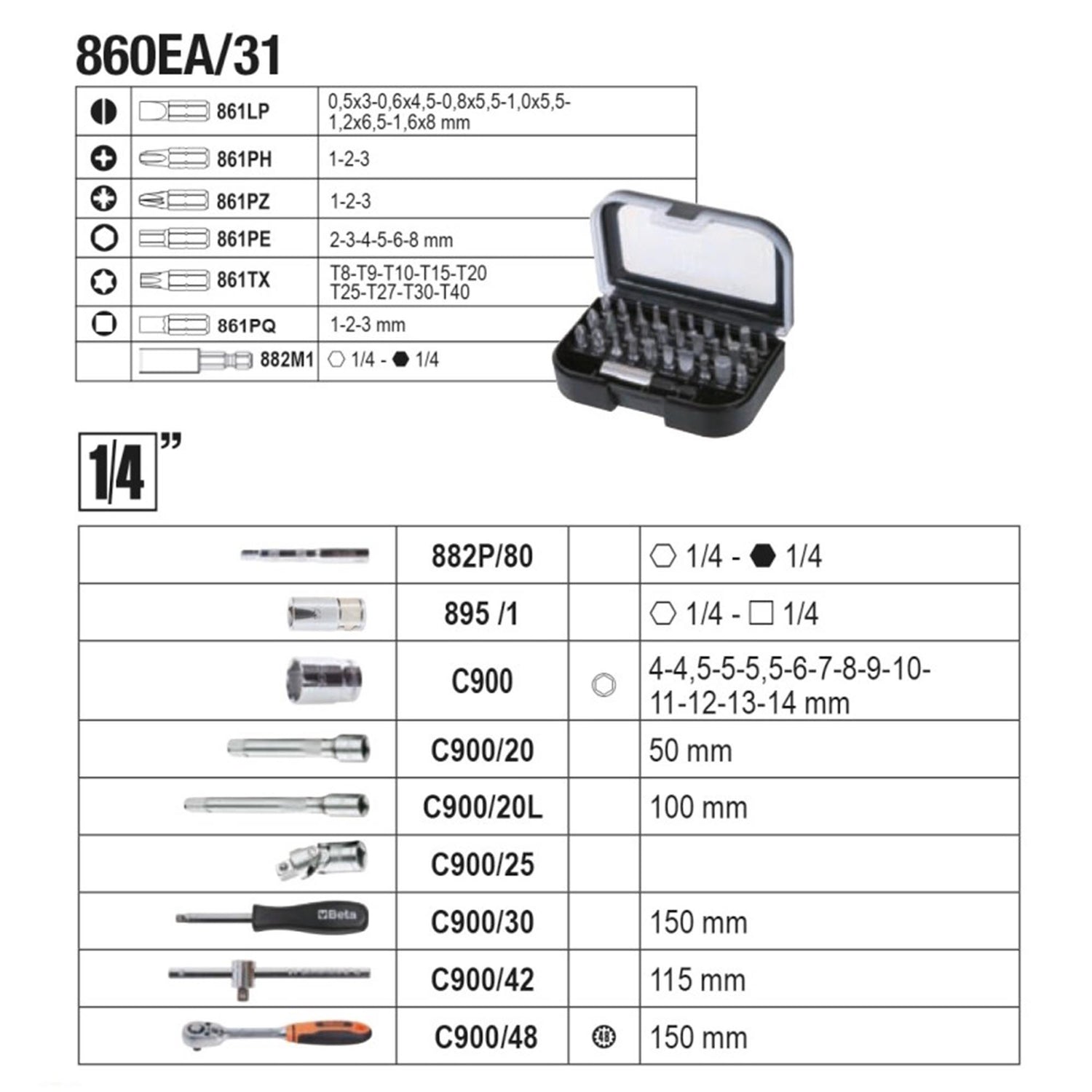 • Tournevis et inserts:Kit complet pour vis à tête fendue, cruciforme et micro-tête.